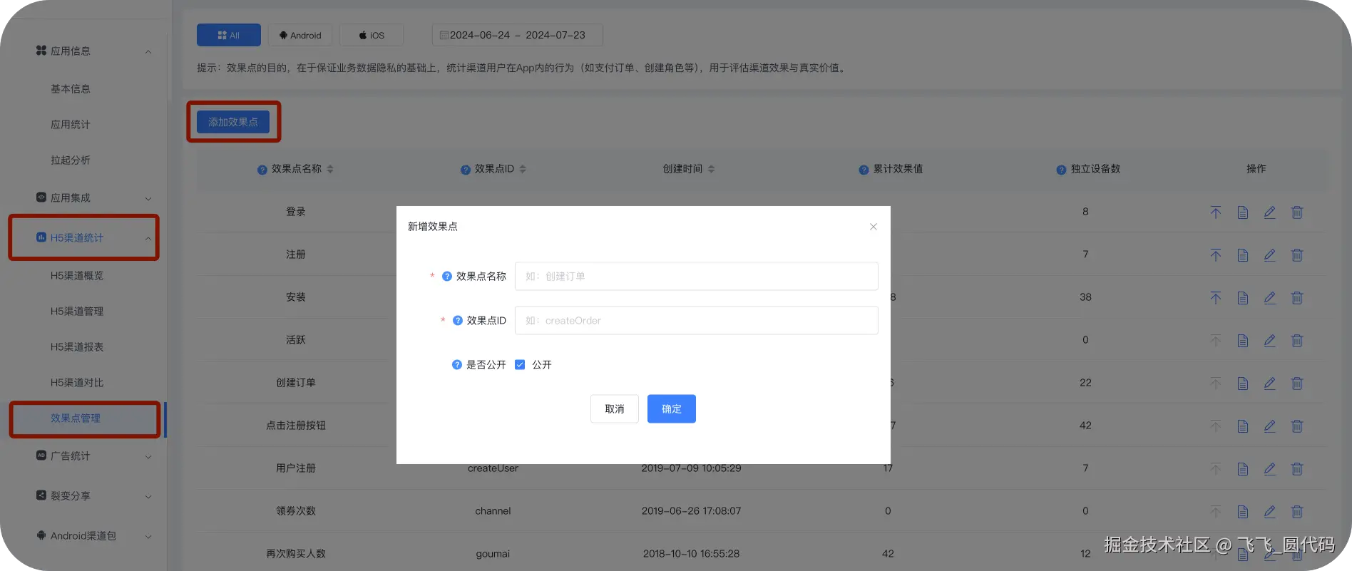 (1)点击【H5渠道统计】—>【效果点管理】—>【添加效果点】根据自身的需要输入【效果点名称】和【效果点ID】。
