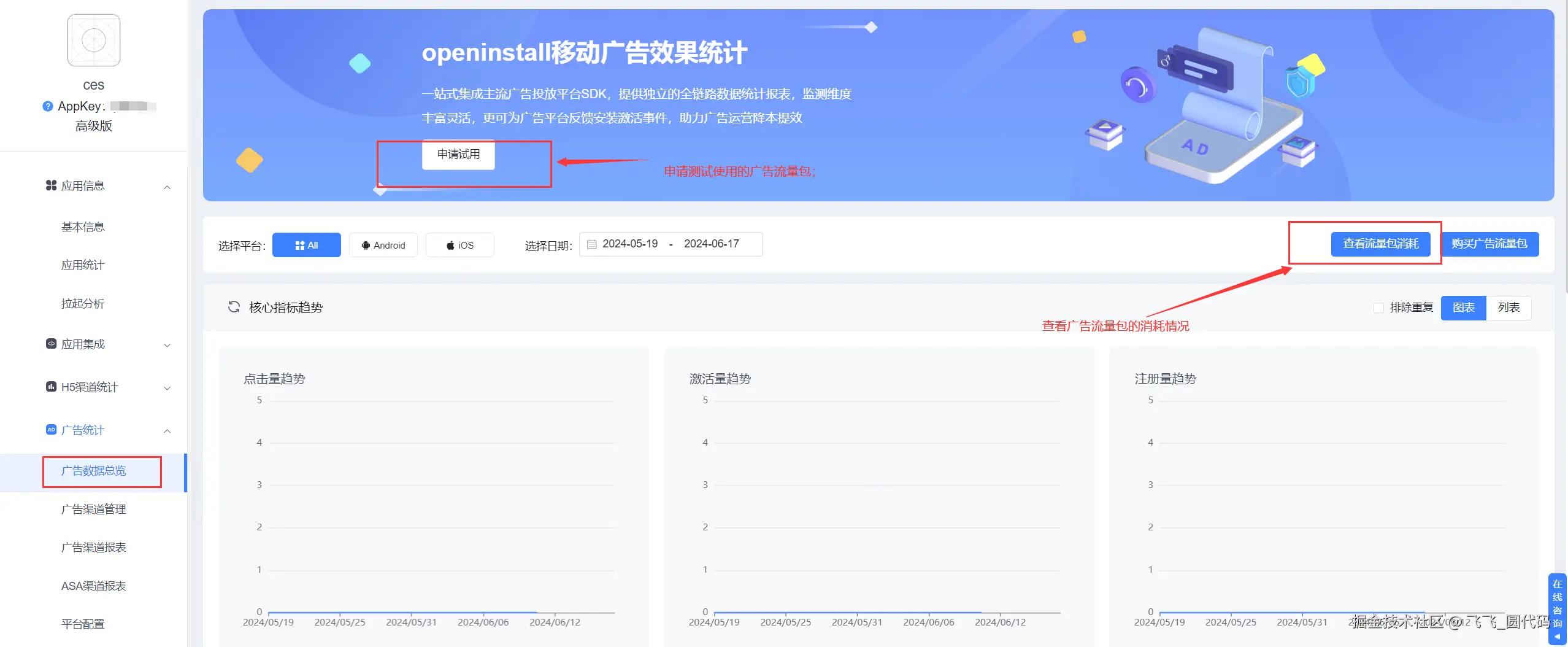 8、联调广告之前可以先申请免费测试用的广告流量包:请到【控制台】—>【广告统计】—>【广告总览】申请五十万广告流量包;广告流量包的消耗情况,可以在右上角点击【查看流量包消耗】了解详情。