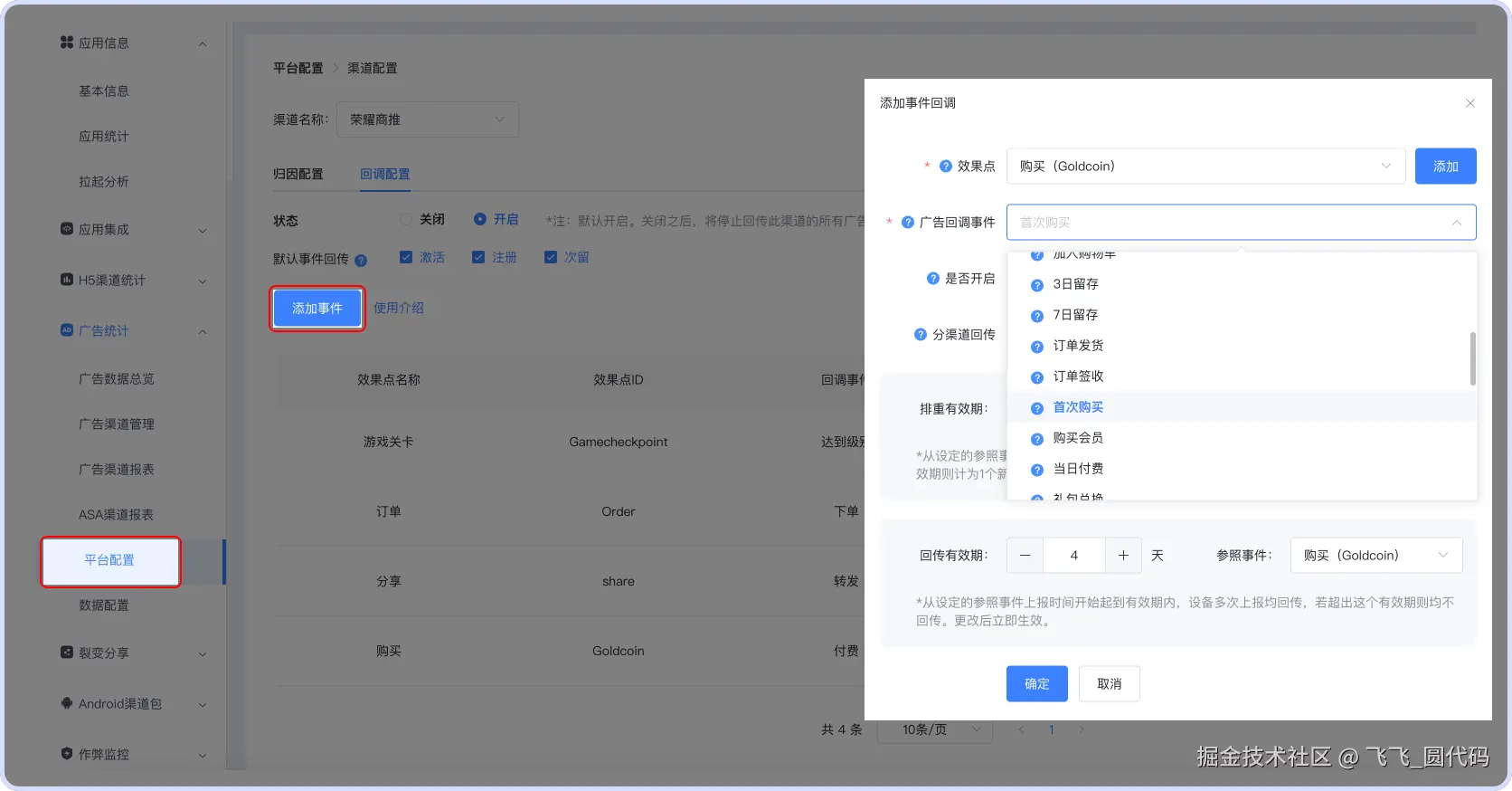 5、针对【广告效果监测】的事件埋点回传需求,想要通过【效果点】数据来映射【广告平台事件】,还需要额外做好映射处理。我们到【广告统计】—>【平台配置】—>【找到对应的广告平台】—>【回调配置】—>【添加事件】—>【选择效果点ID】以及需要映射的【广告事件】,选择好之后,点击确定即可。下面关于【分渠道回传】【排重有效期】【回传有效期】可以暂时搁置,等需要时再进行设置。