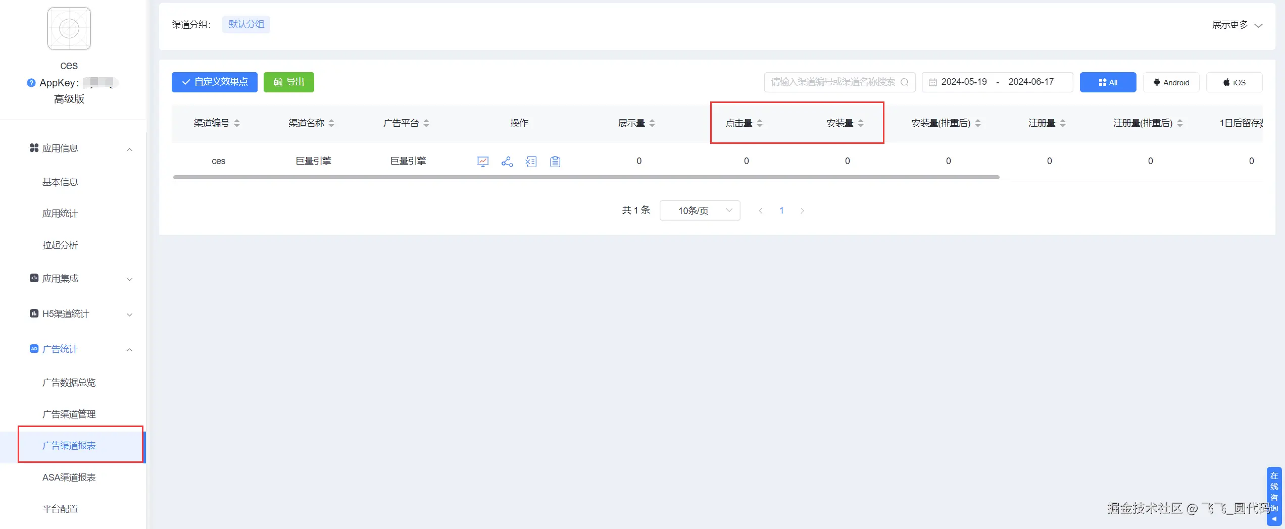 9、第一次联调可以先选择【激活事件】,按照联调文档,将 openinstall 提供的监测链接配置到广告平台,然后找到对应的联调广告,点击广告下载安装App(App需要事先集成 openinstall SDK 以及广告代码),打开App激活之后,到【后台】—>【广告统计】—>【广告渠道报表】,找到对应的广告平台渠道,看【点击量】【安装量】是否增加。