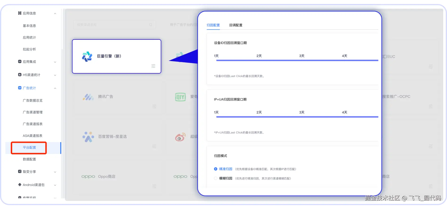 底部的【归因模式】里提供两种方式,【精准归因】优先根据设备ID精准匹配,其次根据IP进行匹配;【模糊归因】优先进行精准归因,其次进行渠道模糊匹配,开发者和广告主可以根据自己买量的归因策略来灵活调整。