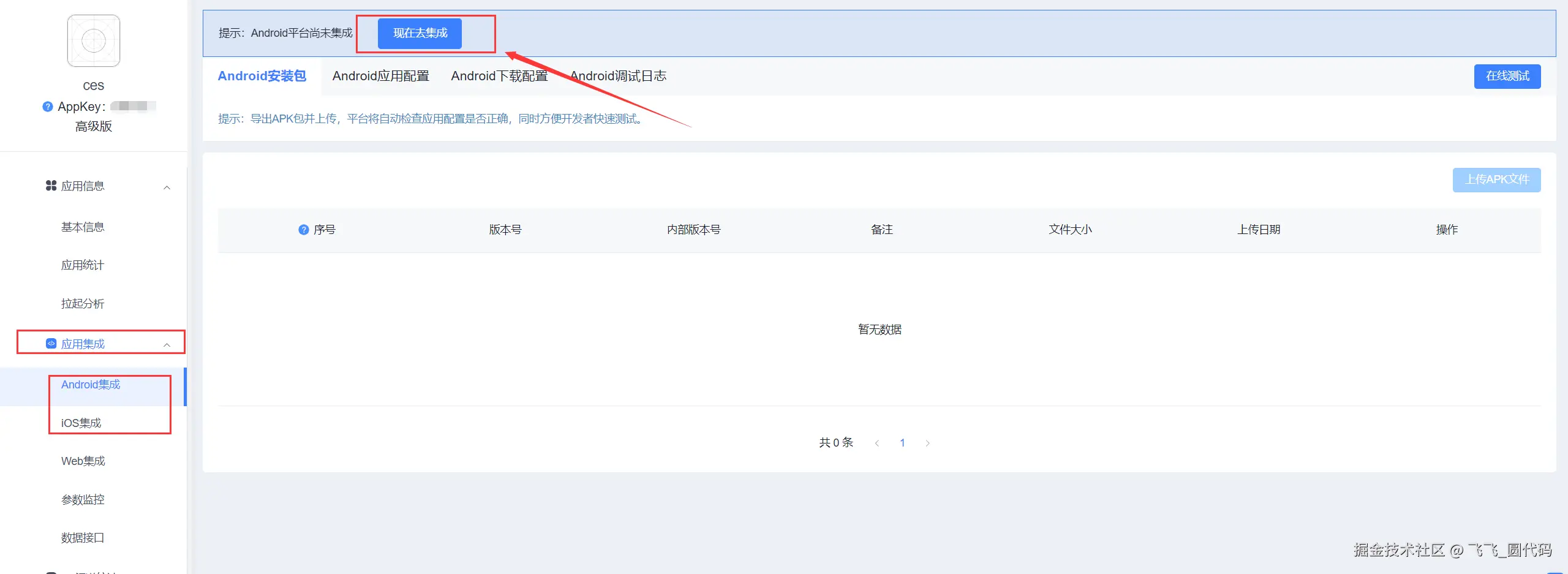 3、进入到应用操作界面之后,先到【应用集成】—>【Android集成】或者【iOS集成】,根据提示完成应用的集成步骤。十分钟就可以完成。