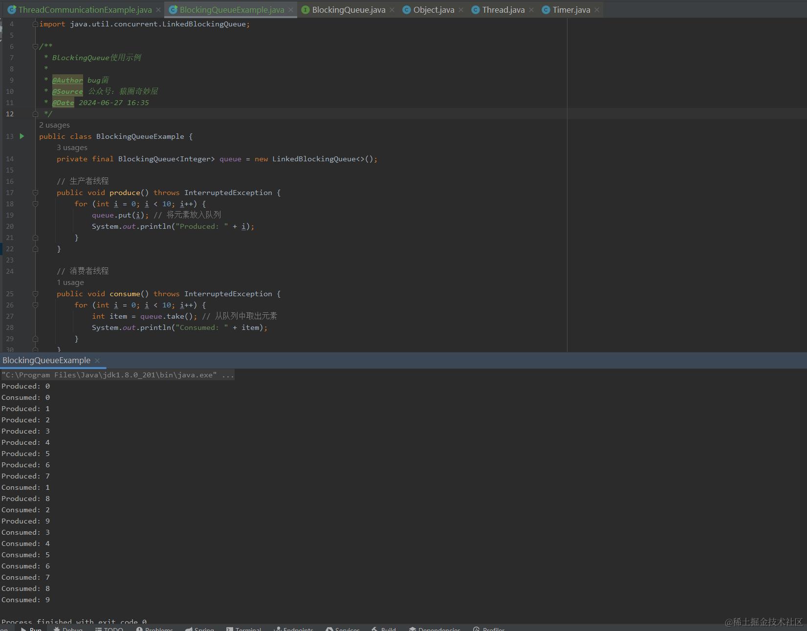 接下来,我便通过一个案例,将如上的三种通信方式都整合在一起协同使用,以下是Object类中与线程通信相关的方法和BlockingQueue接口的基本用法,仅供参考: