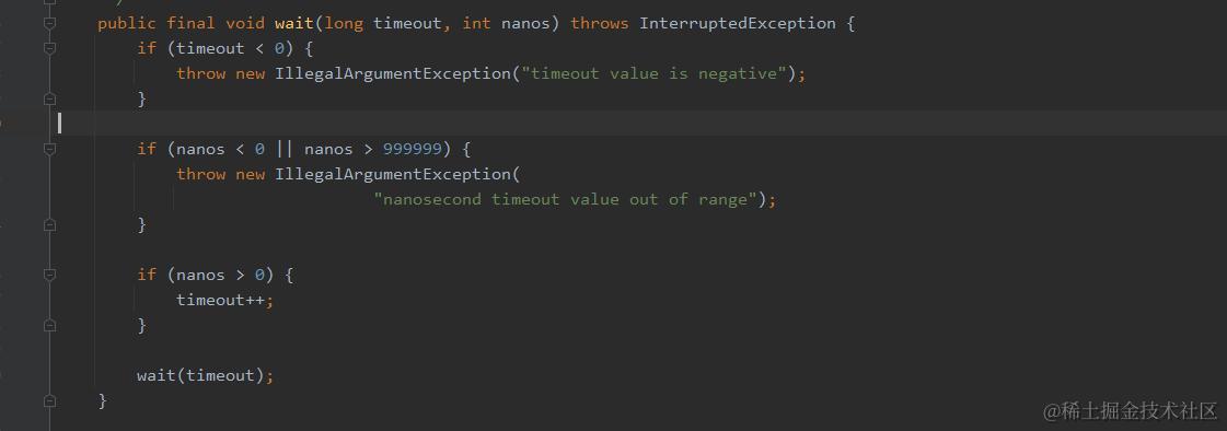 这段代码实际上调用了另一个重载的wait()方法,并传递了0作为超时时间。这意味着线程将无限期地等待,直到收到通知或被中断。传递0作为超时参数通常不是一个好的做法,因为它不会为线程提供任何超时保障,如果需要超时机制,应该传递一个合理的正数作为超时时间。