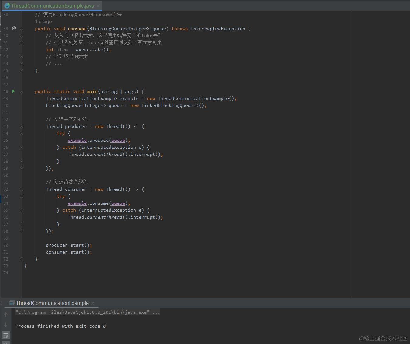 main方法中,创建了一个ThreadCommunicationExample实例和一个LinkedBlockingQueue实例。 - 生产者线程在启动前会调用