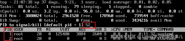 top界面中按k键,输入进程的PID,然后回车确认。进程的PID为top命令回显的第一列数值。例如,要终止PID为52的进程,直接输入“52”后回车。