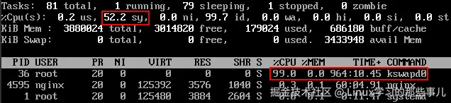 kswapd0进程频繁运行,说明系统可能在进行大量的页面交换操作,这通常与物理内存不足有关。