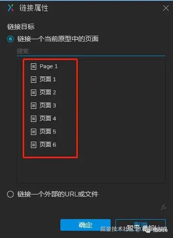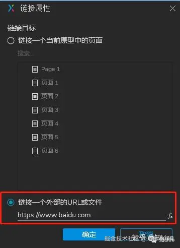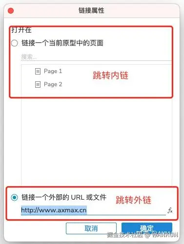 4、选中内联框架控件,然后在“属性”面板中设置其“框架目标”属性,可以选择跳转原型中的页面或者外部链接,这里我们选择链接外部链接并录入Axmax官网地址www.axmax.cn