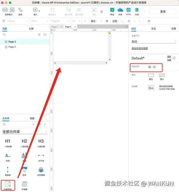 1、在 Axure的页面设置页面左对齐,从元件库拖动内联框架控添加到页面中