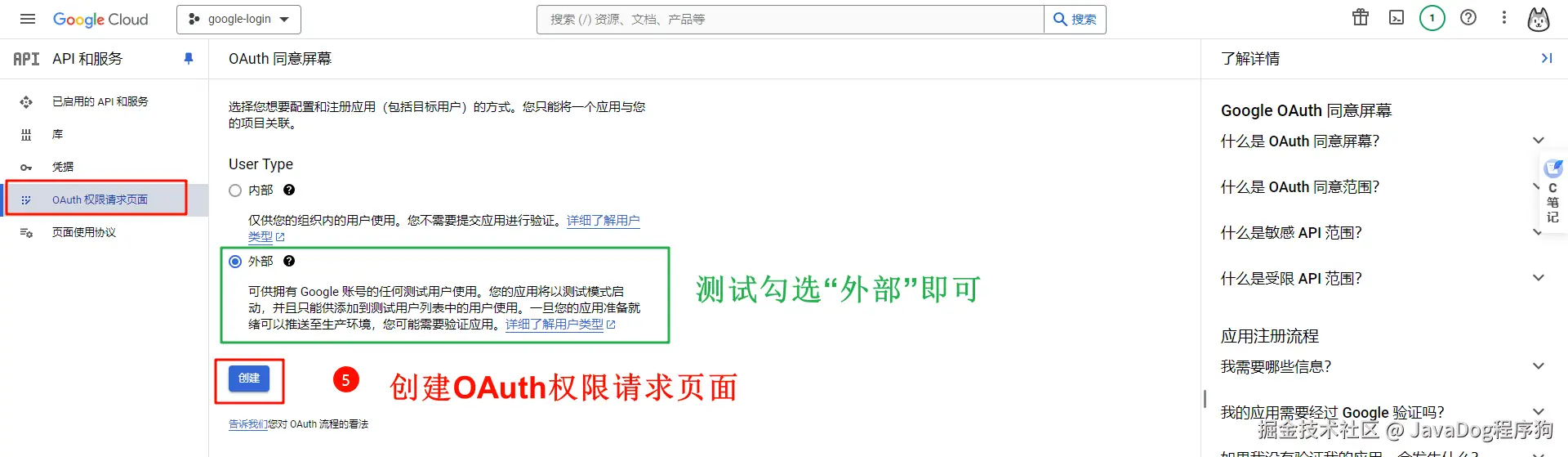 创建OAuth权限请求,选择『外部』,后填写应用信息,如必填项应用名称、用户支持电子邮件、开发者联系信息,其余内容可以先选择性忽略,但是测试用户一定要加上