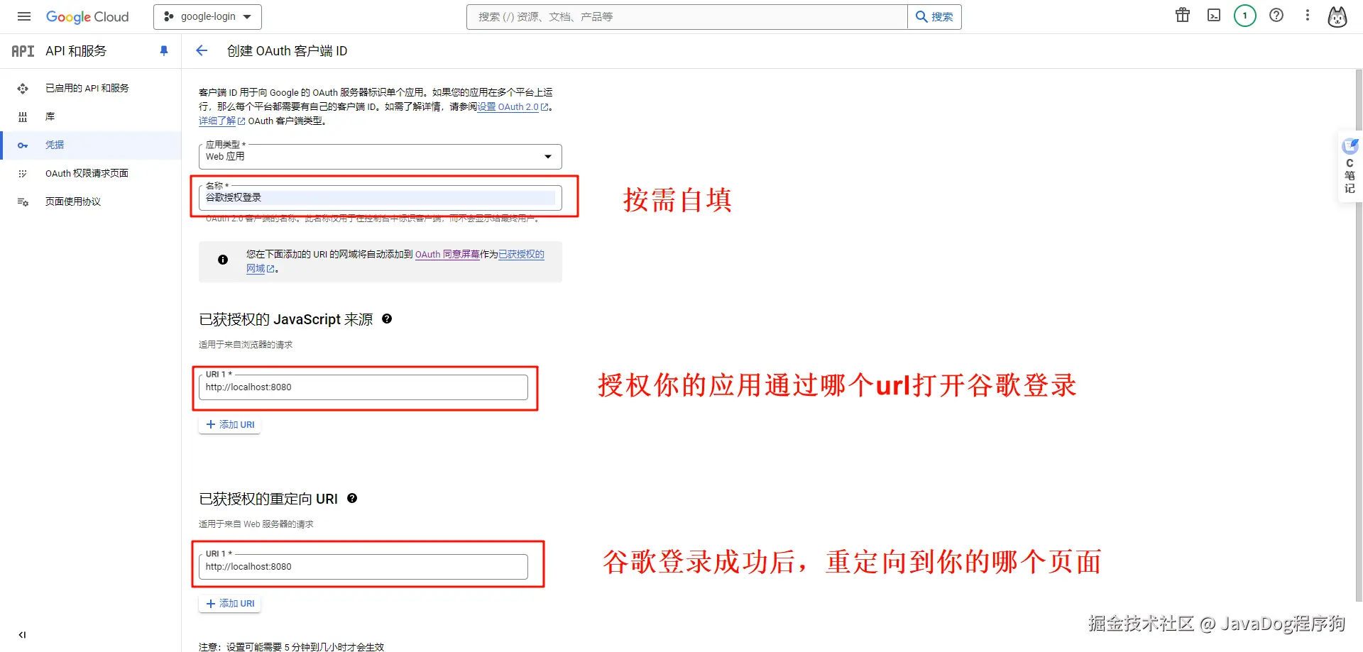 本狗处理业务的页面就在http://localhost:8080,因此对应谷歌开发者配置的 已获授权的JavaScript 来源 和已获授权的重定向 URI两者也填写的http://localhost:8080