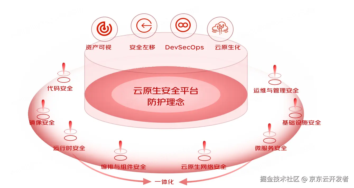 京东在每年的 6.18、11.11 都会面临海量数据和流量增长,各种业务系统都面临着前所未有的挑战。通过对大规模的应用开发和系统的保障实践,京东云安全团队总结出了一套符合DevSecOps场景的一体化全生命周期云原生安全防护理念,形成了保障全生命周期的CNAPP平台——京东云原生安全平台。