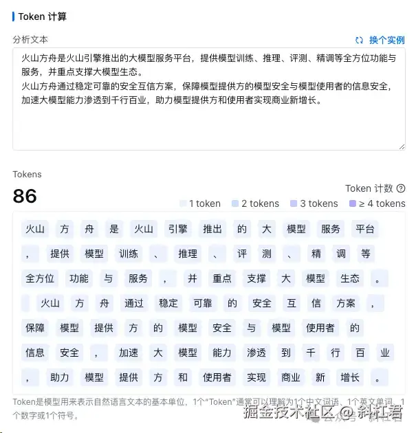 那我们怎么知道我们的一句话是多少token呢?这个我们自己是数不出来的,但可以通过工具测算。例如,火山提供的工具就进行计算: