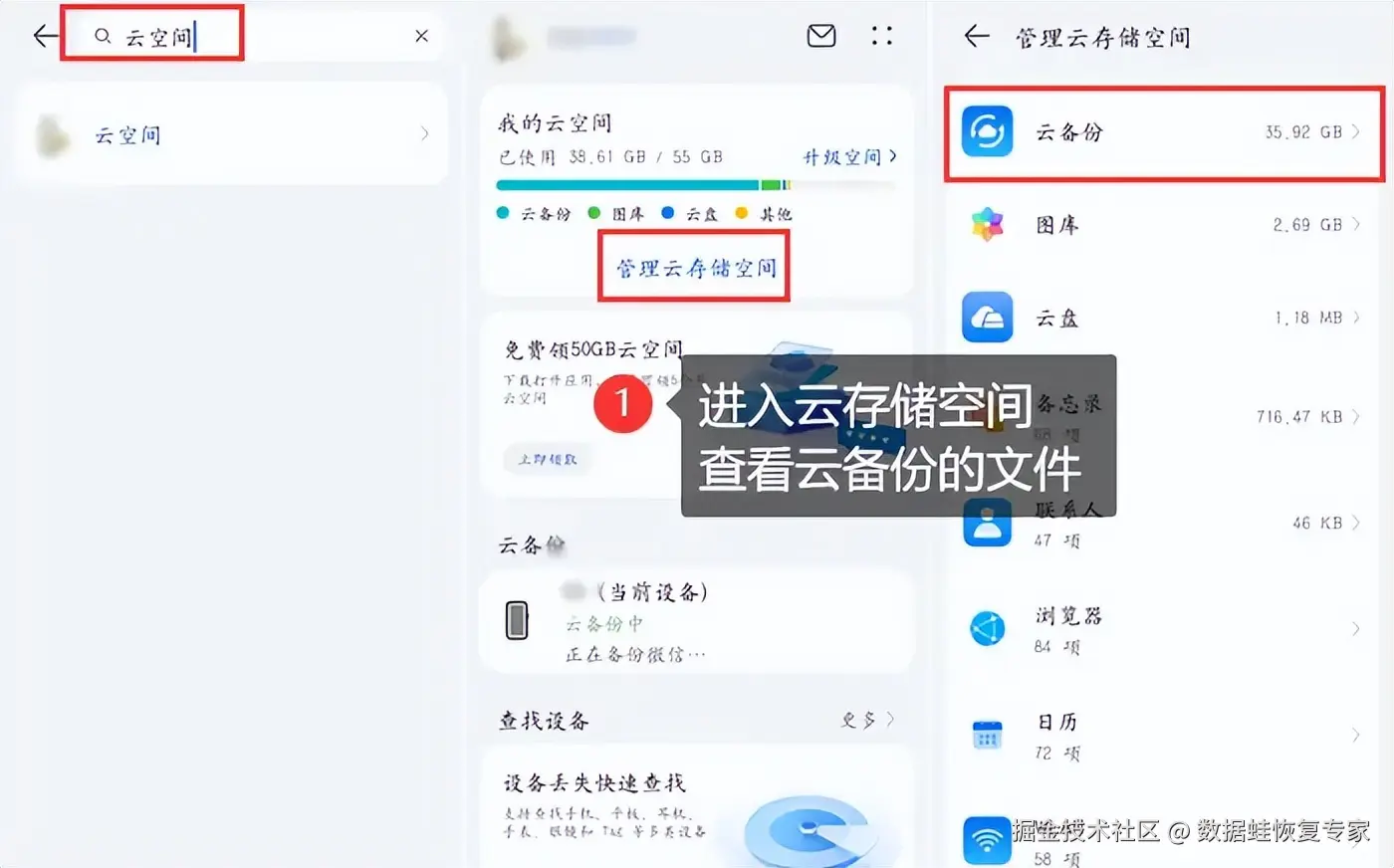 步骤2:选择管理云空间,进入云备份,将需要的数据恢复至本地。
