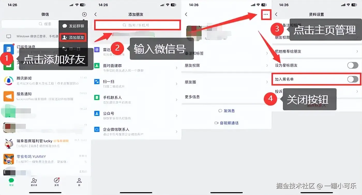 一般我们手动拉黑微信好友的话,可以再微信软件的设置里面重新添加好友。只需要在好友的消息界面中关掉 【加入黑名单】 的按钮就可以啦。那么,苹果手机拉黑了联系人到底要怎么恢复呢?下面就是具体的操作步骤啦。