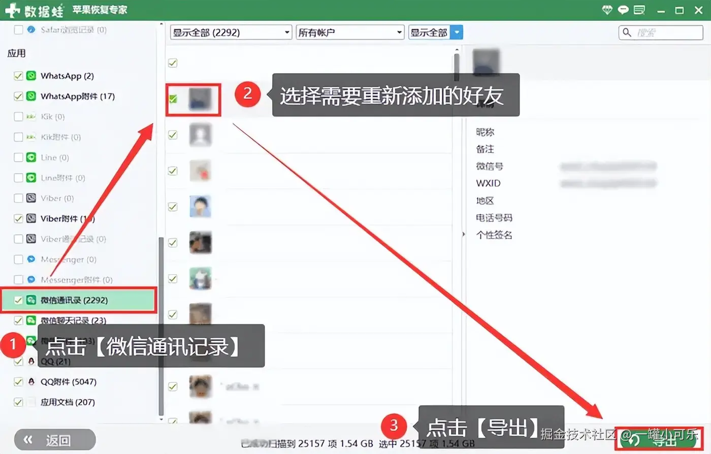步骤3:看到左侧的导航栏中的数据菜单,点击选择 【微信通讯录】 ,然后他就会显示微信里面的好友,点击勾选被拉黑的好友,就会再界面的右侧显示好友的微信号。这时,我们可以复制其微信号到手机上添加好友,也可以直接点击界面下方的 【导出】 按钮。