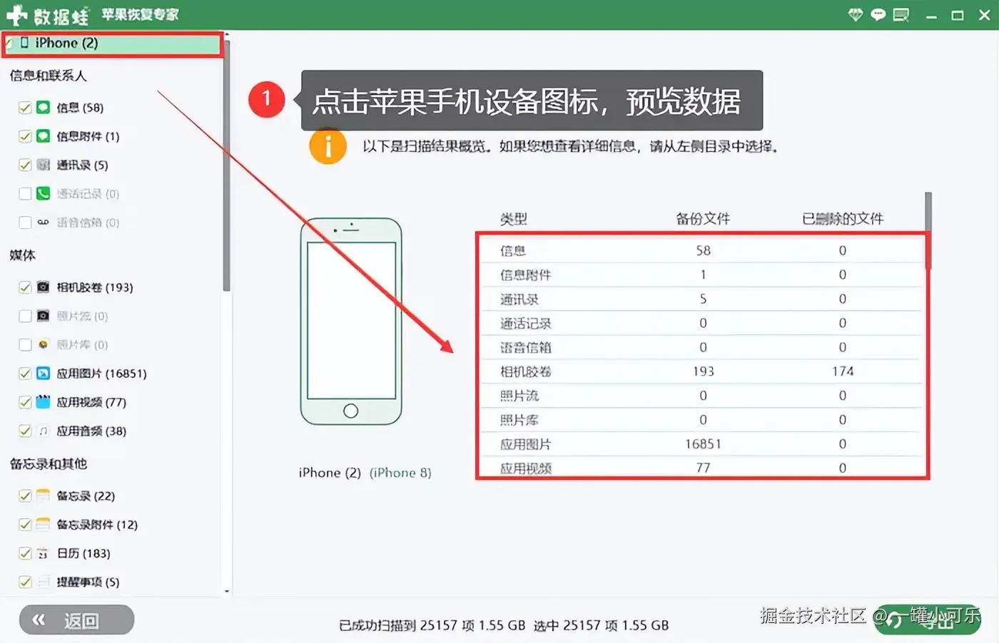 步骤2:下一步就是等待数据扫描。扫描完成之后,可以点击设备图标,预览总体的扫描数据。