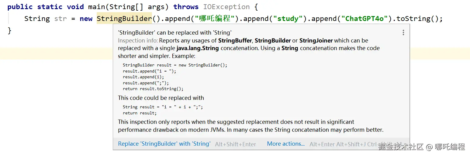 IDEA 提供了自动替换的选项,点击提示框中的 “Replace 'StringBuilder' with 'String'” 即可自动进行替换。