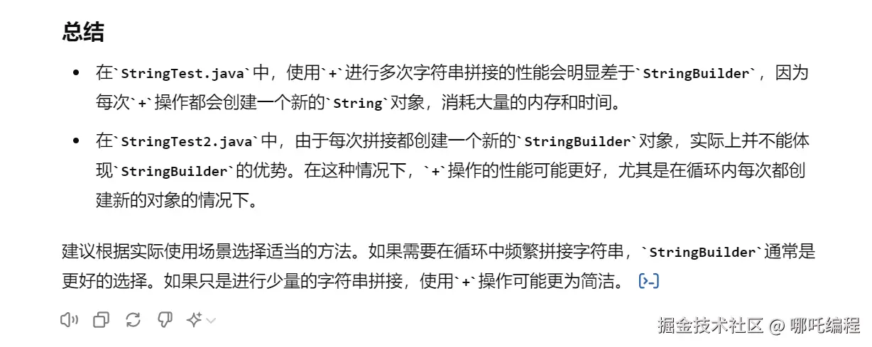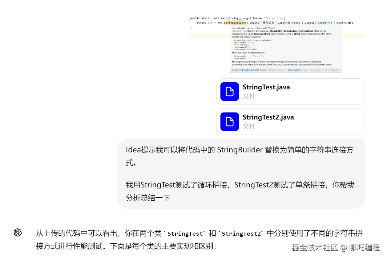 做一个小测试,拼接10000个"哪吒编程" + "study" + "ChatGPT4o",看下使用“+”拼接字符串和使用StringBuilder,哪个速度快。