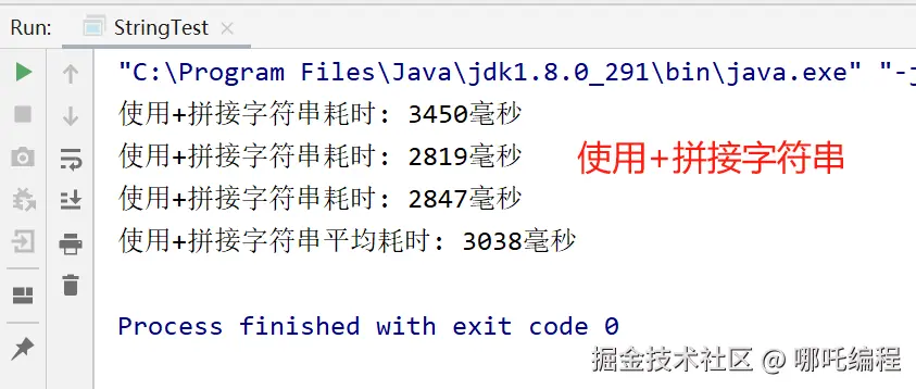 System.out.println("使用+拼接字符串平均耗时: " + timeSum/3 +"毫秒");