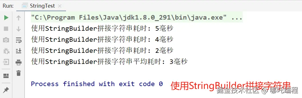 System.out.println("使用StringBuilder拼接字符串平均耗时: " + timeSum / 3 + "毫秒");