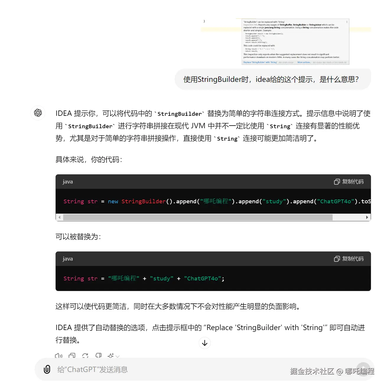 提示信息中说明了使用 StringBuilder 进行字符串拼接在现代 JVM 中并不一定比使用 String 连接有显著的性能优势,尤其是对于简单的字符串拼接操作,直接使用 String 连接可能更加简洁明了。