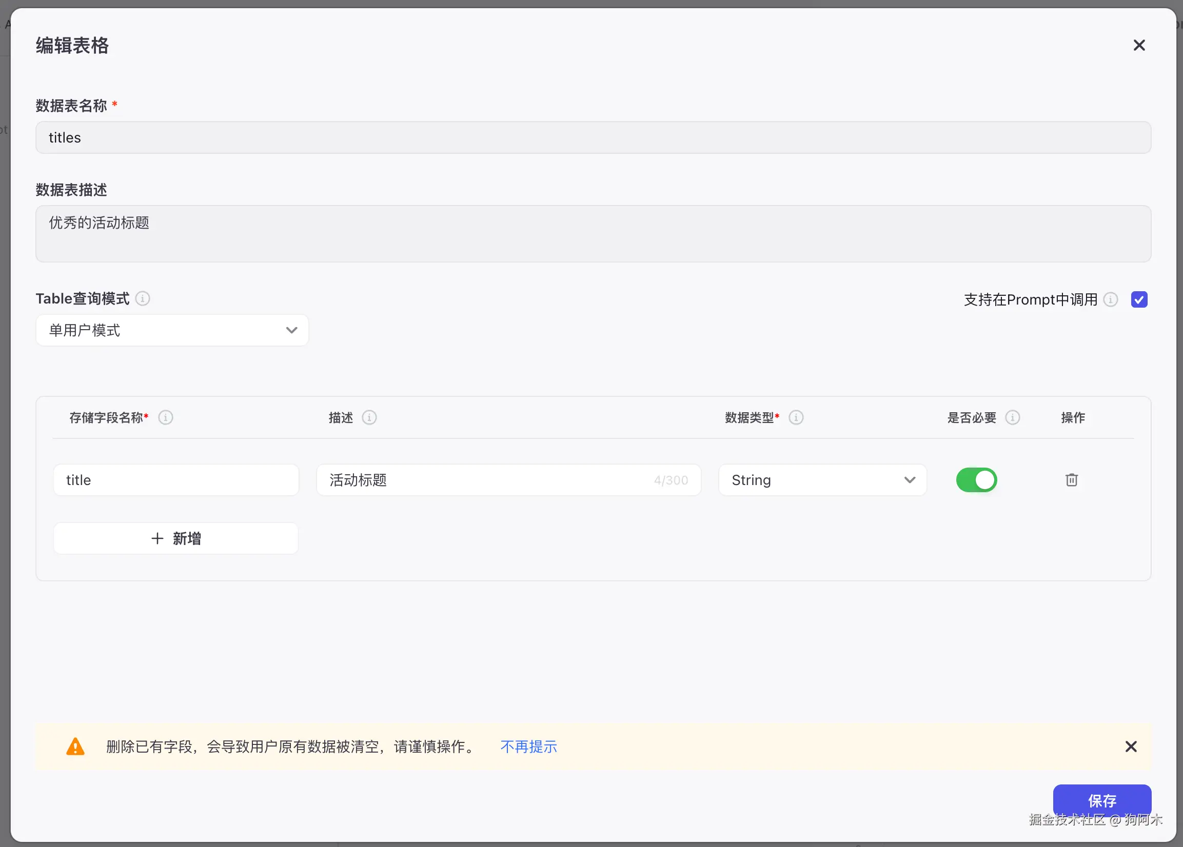 首先我们创建一下知识库,只有一个字段,就是活动标题