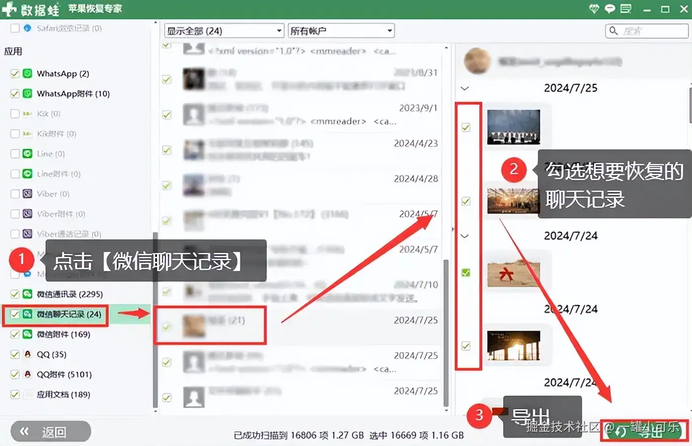 步骤3:扫描结束后,预览扫描出来的数据,找到 【微信聊天记录】 选项并点击,软件就会在界面的右侧出现扫描出来的数据,勾选你需要恢复的那条聊天记录,点击右下角的 【导出】 。