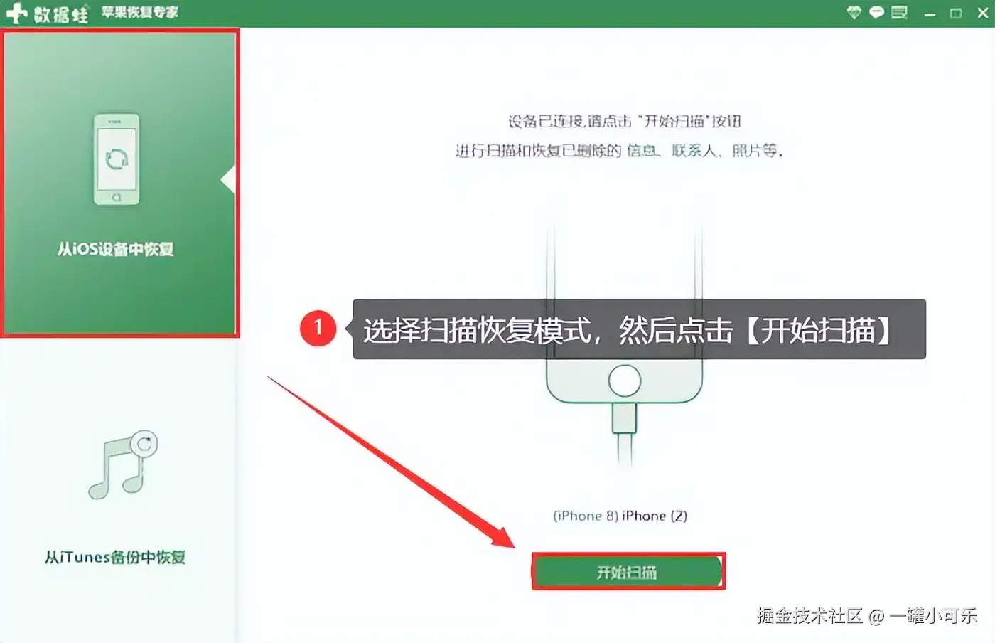 步骤2:连接完成后,需要确认使用哪一种方式对手机数据进行扫描(从iPhone中扫描/从iTunes备份中扫描),然后点击 【开始扫描】。