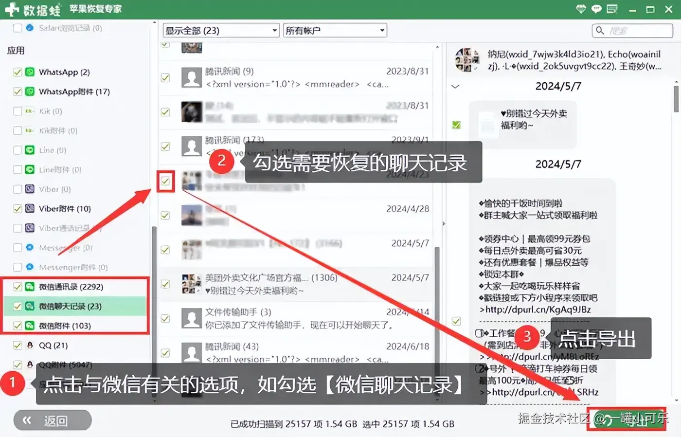 步骤3:软件扫描完成之后,用户可以浏览大致的数据,点击 【微信聊天记录】 ,勾选需要恢复的聊天记录,再点击 【导出】 即可。