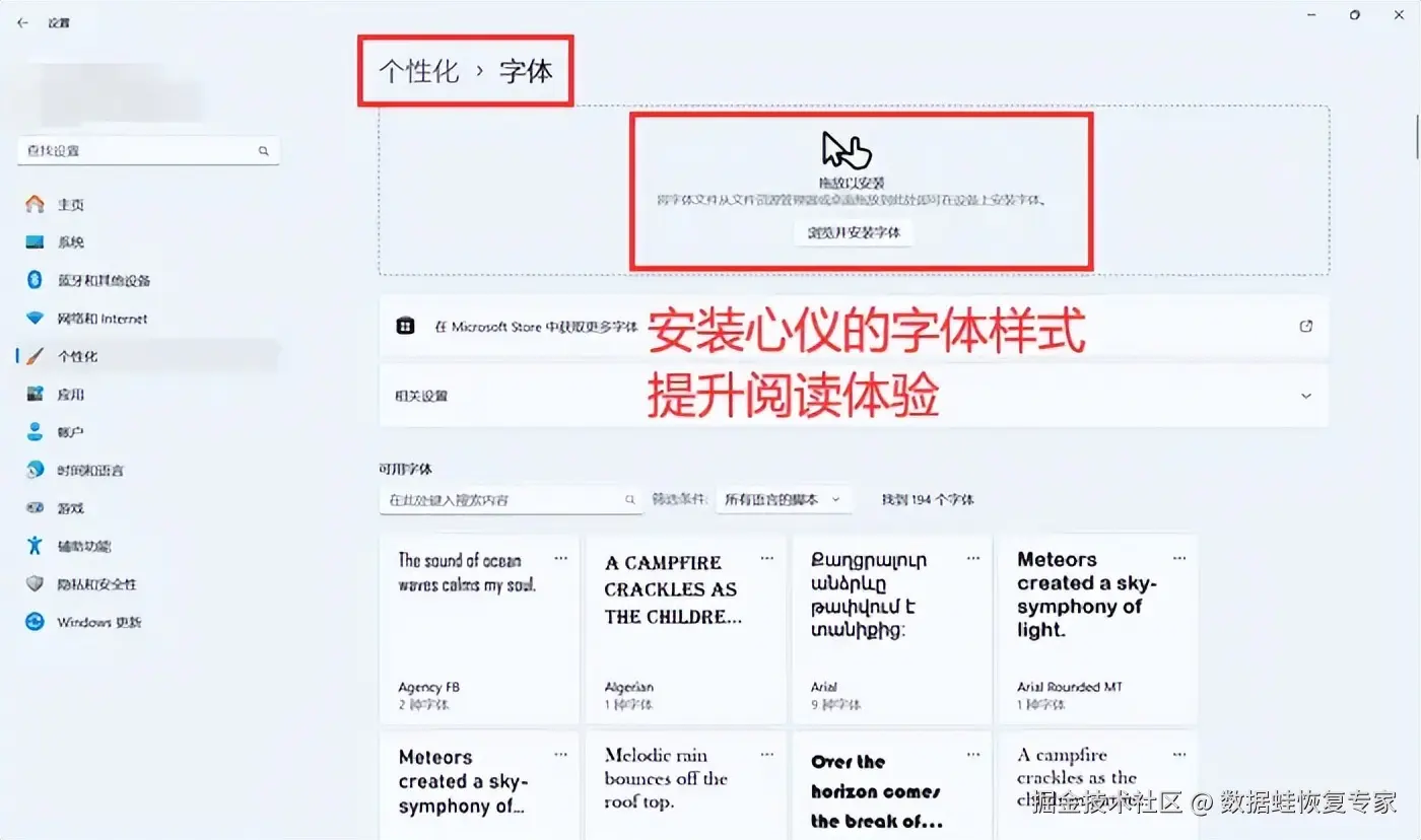 调整好字号后,不妨尝试一些新的字体样式,能够给你的文档或者网页浏览带来全新的视觉体验。你可以在 【设置】 的 【个性化】 中安装你喜欢的字体样式,并进行使用。记得在选择新字体时,确保它的可读性和美观性,以适应你的阅读习惯和审美需求。