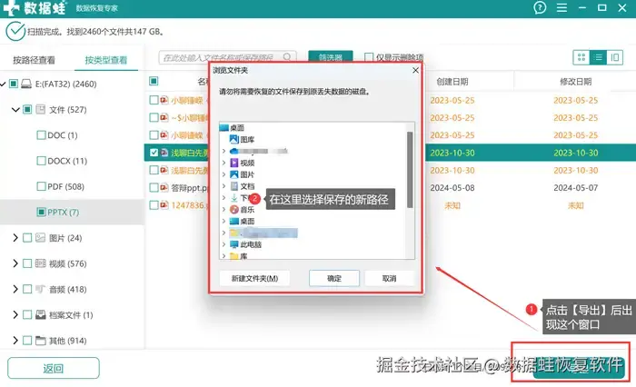 第5步: 点击【导出】后,选择保存恢复文件的新路径 (这里千万不能再选D盘!) ,就完成数据文件的恢复。