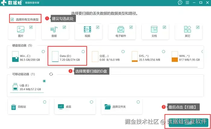 第3步: 进入主页面后,在页面上方选择需要恢复的文件类型,建议勾选【选择所有文件类型】。然后在中部选择【D盘】作为扫描的路径,最后点击【扫描】。