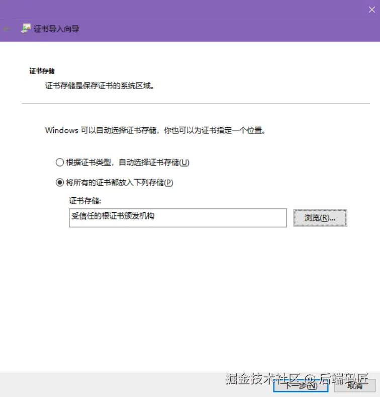 自签证书浏览器无法识别安全性,需要手动添加 受信任的根证书颁发机构,不然上线的时候会有证书无效问题。