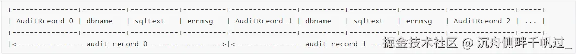 - temp cache file 以字节流的形式依次保存 AuditRceord,dbname,sqltext,errmsg 等信息,具体分布分布如下: