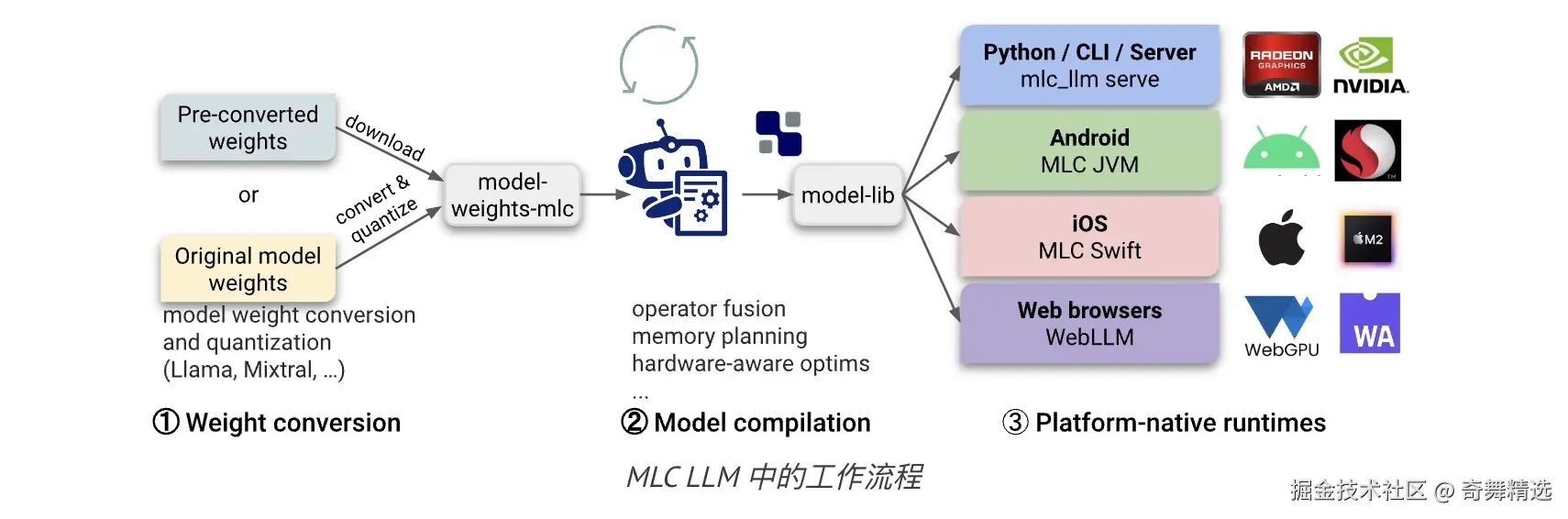 2、Python 中的模型编译。模型由TVM Unity编译器编译,其中编译配置为纯 Python。MLC LLM 将基于 Python 的模型量化导出到模型库并量化模型权重。可以用纯 Python 开发量化和优化算法,以针对特定用例压缩和加速 LLM。