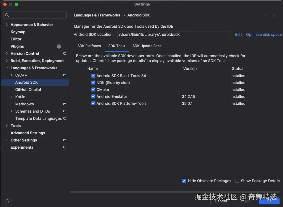 其中Android Studio可以在官网中去下载。 在 Android Studio 单击“File → Settings → Languages & Frameworks → Android SDK → SDK Tools”,选择安装NDK、CMake和Android SDK Platform-Tools。安装完成后,需要在环境变量中去对NDK等进行配置才可使用。