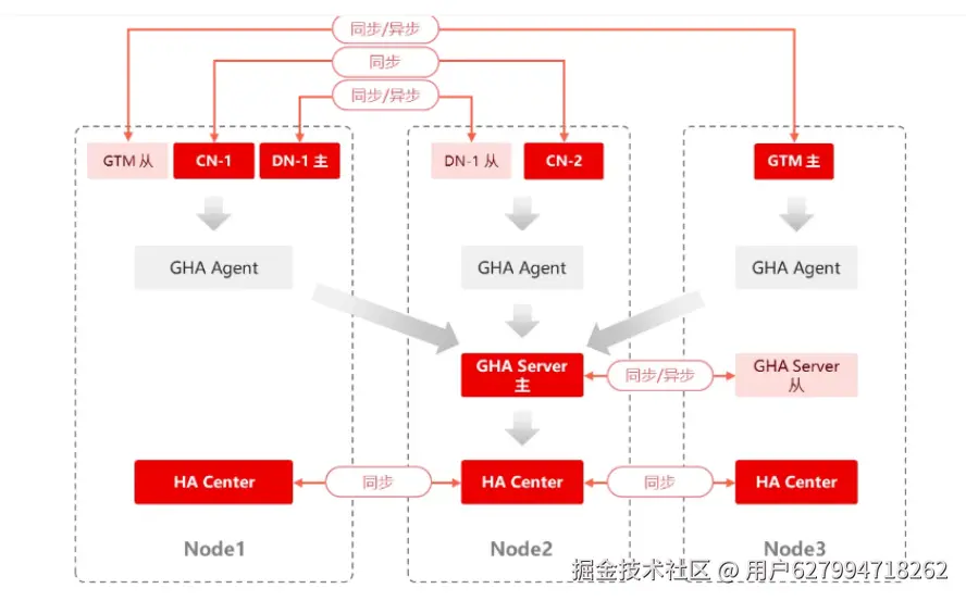 - GHA Server(等效于patroni):集群管理器,采用主备的高可用架构,主备之间可以配置同步或异步方式。用以管理整个集群各个节点的高可用状态(主备、死活等)。GHA Server的主备信息与DN类似,也是将leader信息存在HA Center上,谁先写谁就是主,需要周期更新,如果超过TTL没更新就会删掉leader信息,其他节点去写就能写进去就变成leader了。