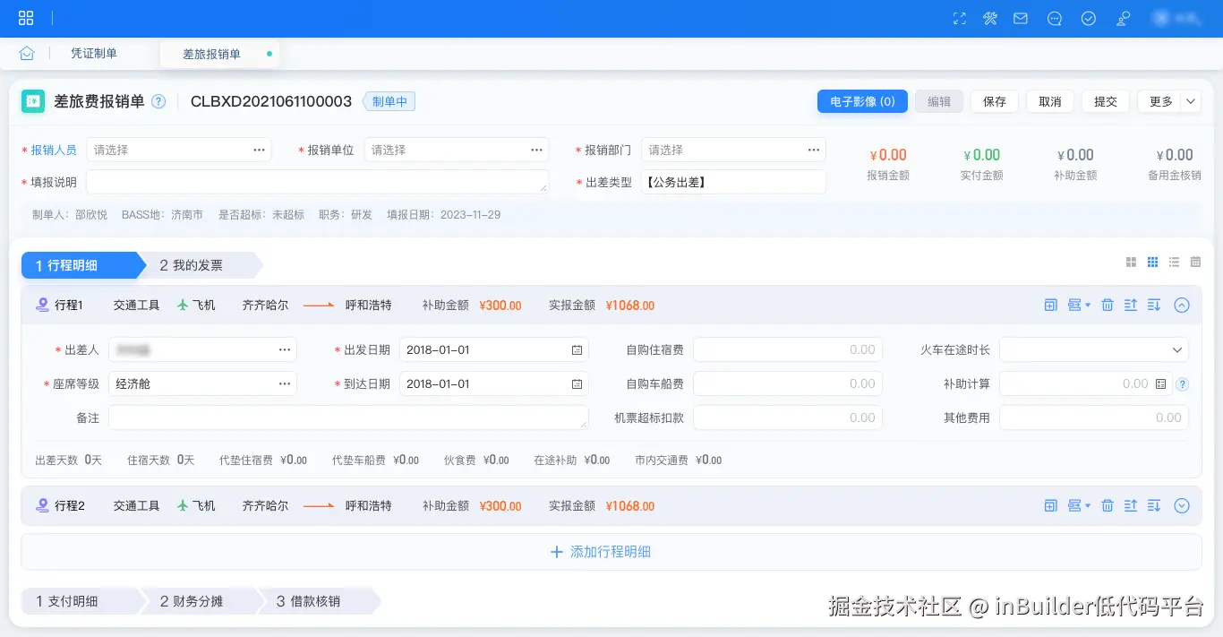 - 直观的流程引导:界面对报销子表增加了流程式导航设计,引导用户分步骤完成任务。