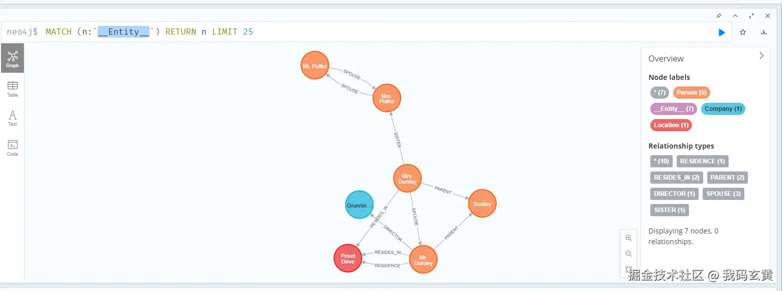 便可以看到我们创建的 graph 了,它会对我们刚刚的段落里,每个角色和关系被清晰的创建和连接。