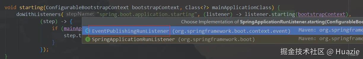 从上述截图可知,这里多播了 ApplicationStartingEvent 事件,我们如果想要监听这个事件,只需要实现对应的事件监听器,并添加到监听器列表 listeners 中即可。