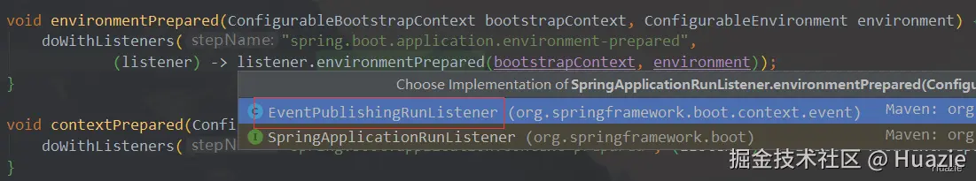 从上述截图可知,这里显然在环境配置准备完成之后,多播了 ApplicationEnvironmentPreparedEvent 事件,我们如果想要监听这个事件,只需要实现对应的事件监听器,并添加到监听器列表 listeners 中即可。