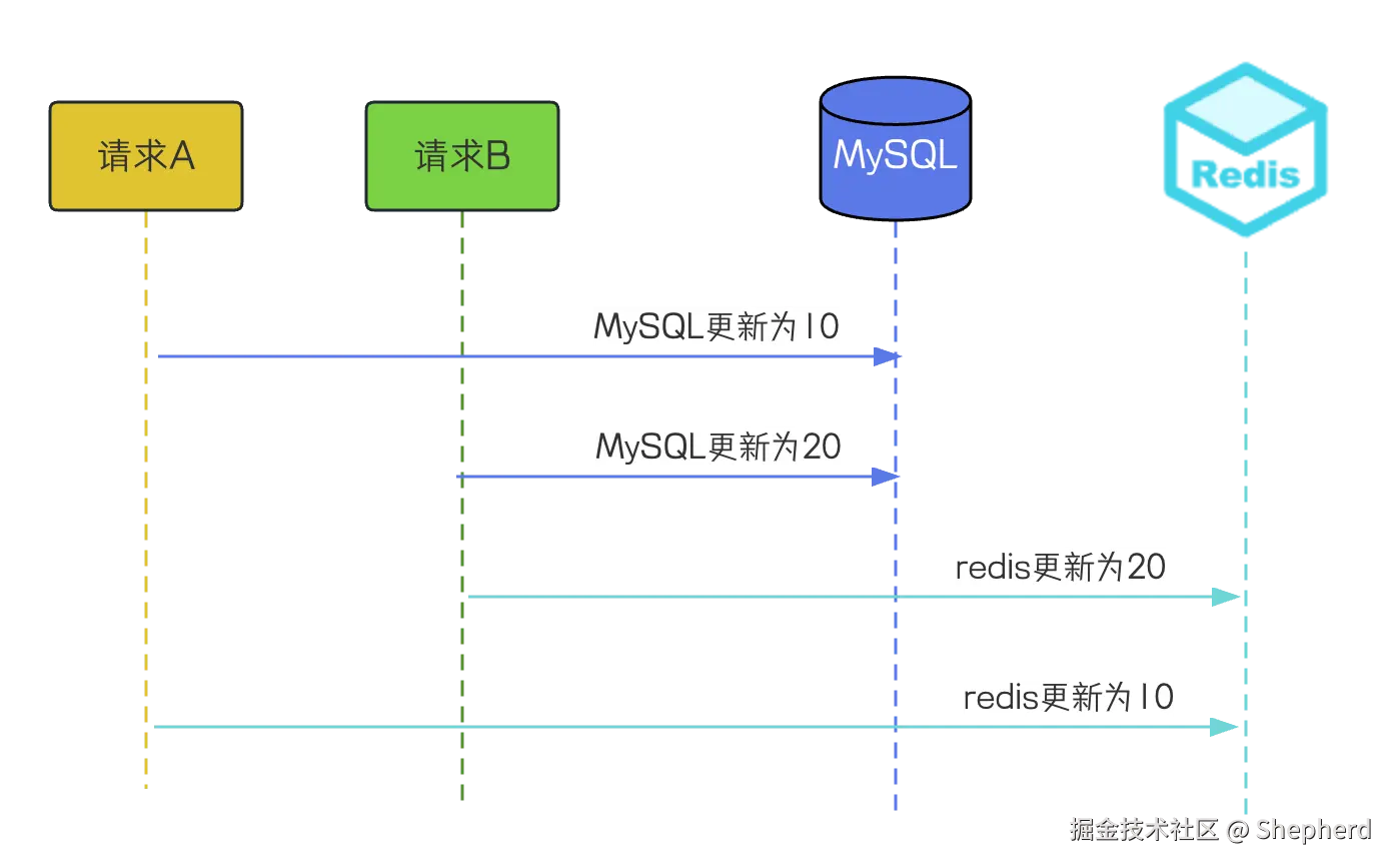 请求 A、B 都是先写 MySQL,然后再写 Redis,在高并发情况下,如果请求 A 在写 Redis 时卡了一会(网络抖动或服务阻塞),请求 B 已经依次完成数据的更新,就会出现图中的问题。并发场景下,这样的情况是很容易出现的,每个线程的操作先后顺序不同,这样就导致请求B的缓存值被请求A给覆盖了,数据库中是请求B的新值,缓存中是请求A的旧值,并且会一直这么脏下去直到缓存失效(如果你设置了过期时间的话)。
