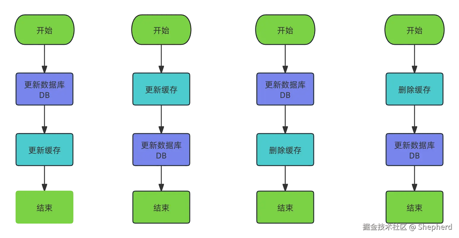 基于上面的概述可以知道读取数据的流程几乎是固定的,但是对于数据库与缓存双写就存在4种方式可供选择,下面我们就来看看这4种方式在高并发场景下进行数据双写同步怎么就有问题了: