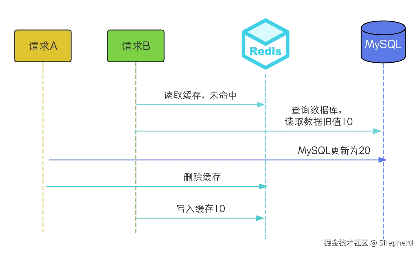 这个情况缓存存入的是旧值10,但是数据库已经写入了新值20,数据不一致了。