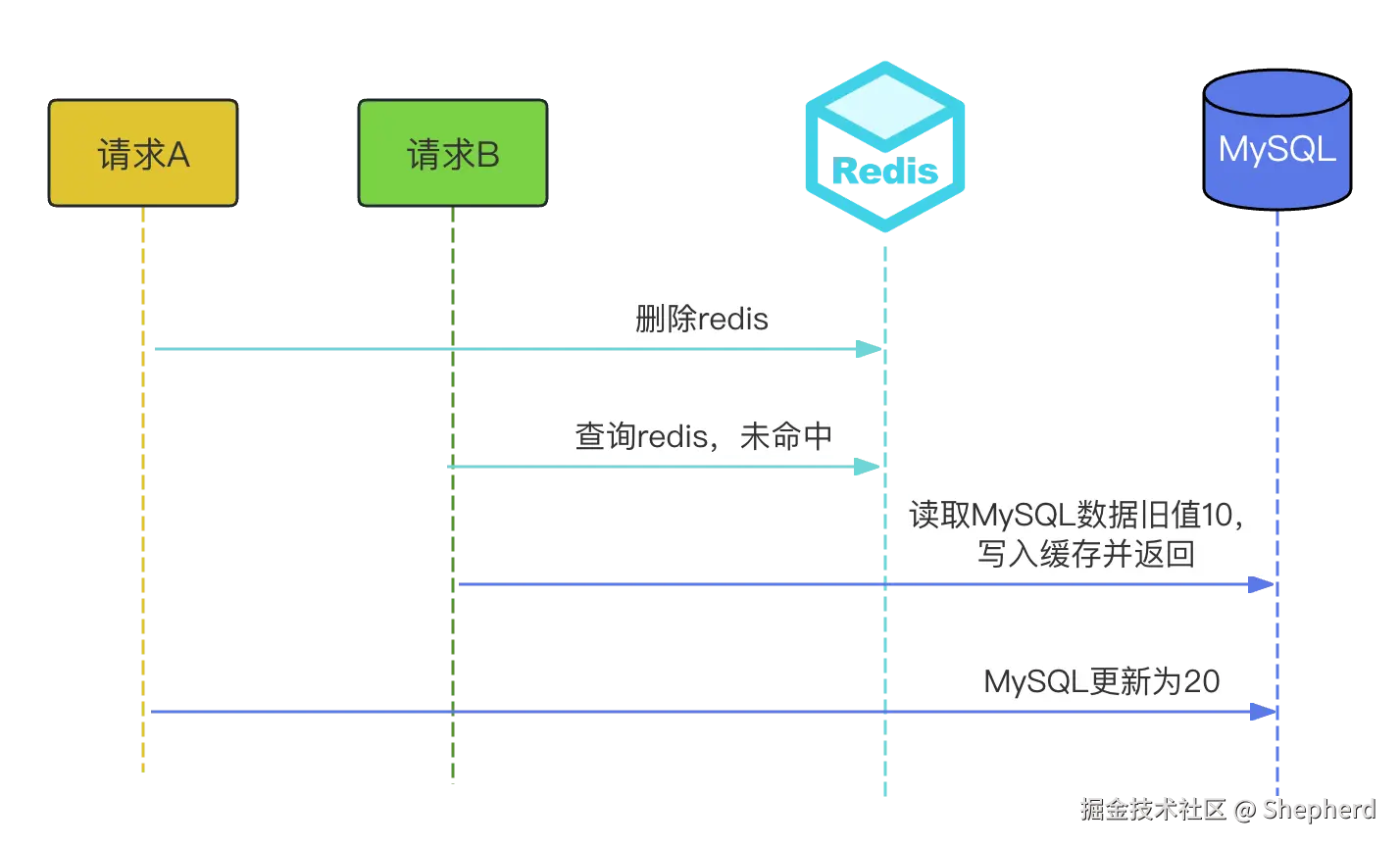 删除缓存是为了下一次读取数据命中不了缓存通过查询数据库重建缓存,这就变成删除缓存和读取数据的先后顺序的事情了:这里我们假设请求A是写数据,请求B是读取数据,如下图所示: