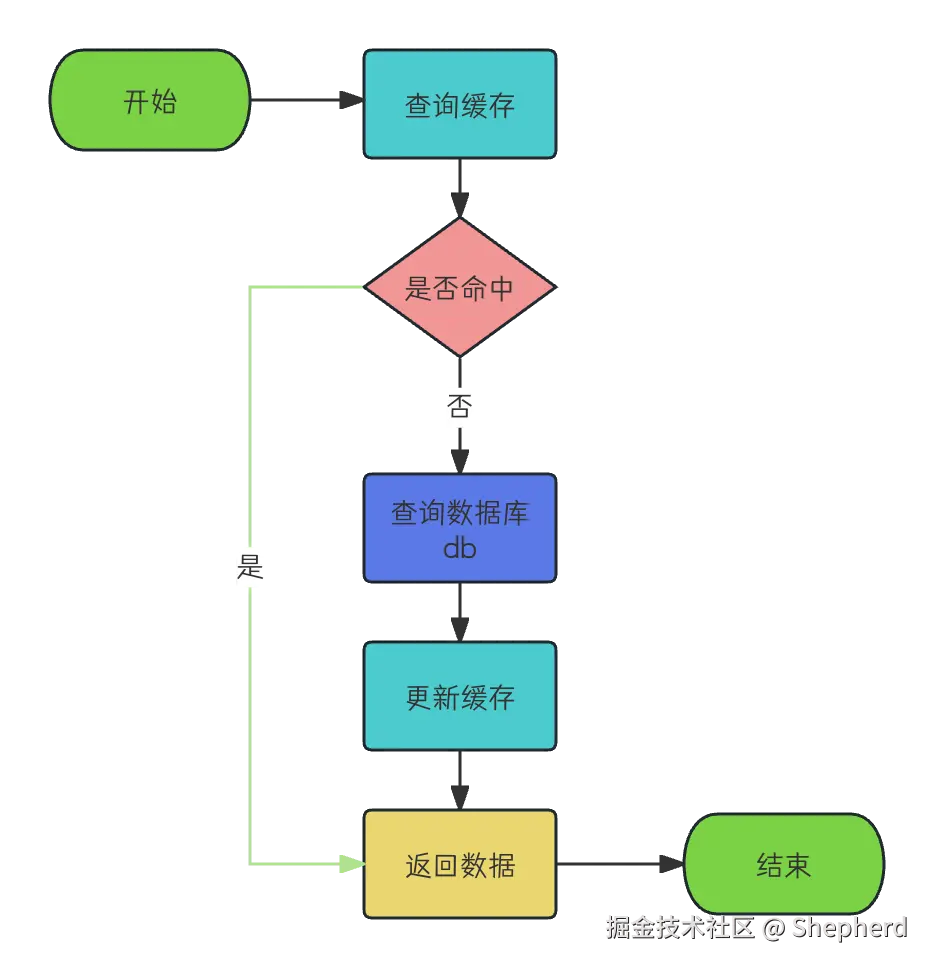 读取数据流程大概是这样的:先查询缓存,获取到数据直接返回,查询不到,再从数据库DB查询数据,拿到数据之后更新缓存,再返回数据。流程图如下所示:
