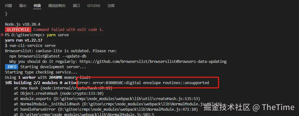 Error: error:0308010C:digital envelope routines::unsupported TheTime 2024-07-26 93 阅读1分钟 运行项目卡住还报错一堆,如下图: ###原因: node.js V17版本中最近发布的OpenSSL3.0, 而OpenSSL3.0对允许算法和密钥大小增加了严格的限制 ###解决方案 安装一个v17以下的版本,切换到该版本,然后再运行项目就可以了 nvm 的一些常用命令 nvm ls //已安装的node版本 nvm install 16.20.2 //安装指定版本 nvm use 16.20.2 //切换到版本