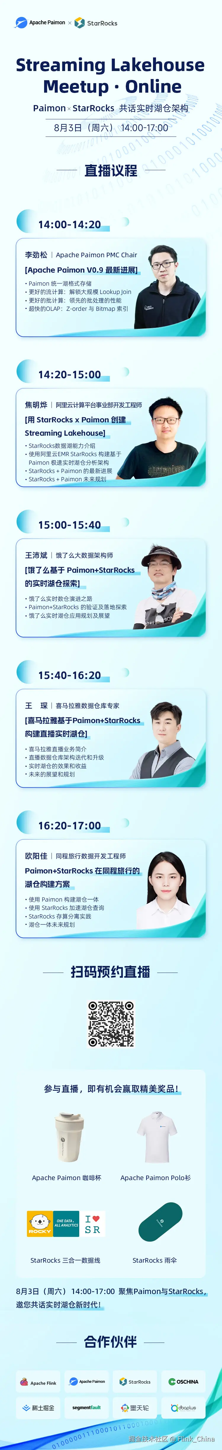 为了加速湖仓架构在企业中的实践与落地,Apache Paimon 社区与 StarRocks 社区强强联手,于 8 月 3 日 14:00 联手举办 Streaming Lakehouse Meetup · Online 。希望能帮助大数据从业者们实现湖仓在灵活性、可扩展性、成本效益和实时性的承诺。