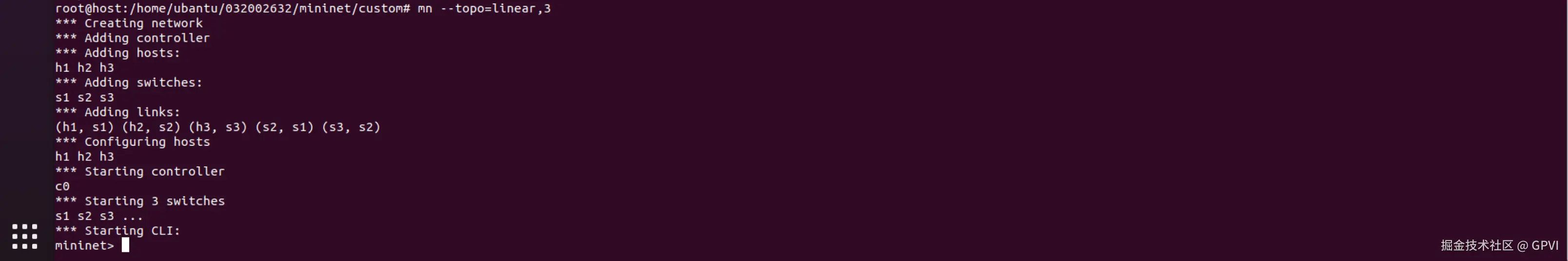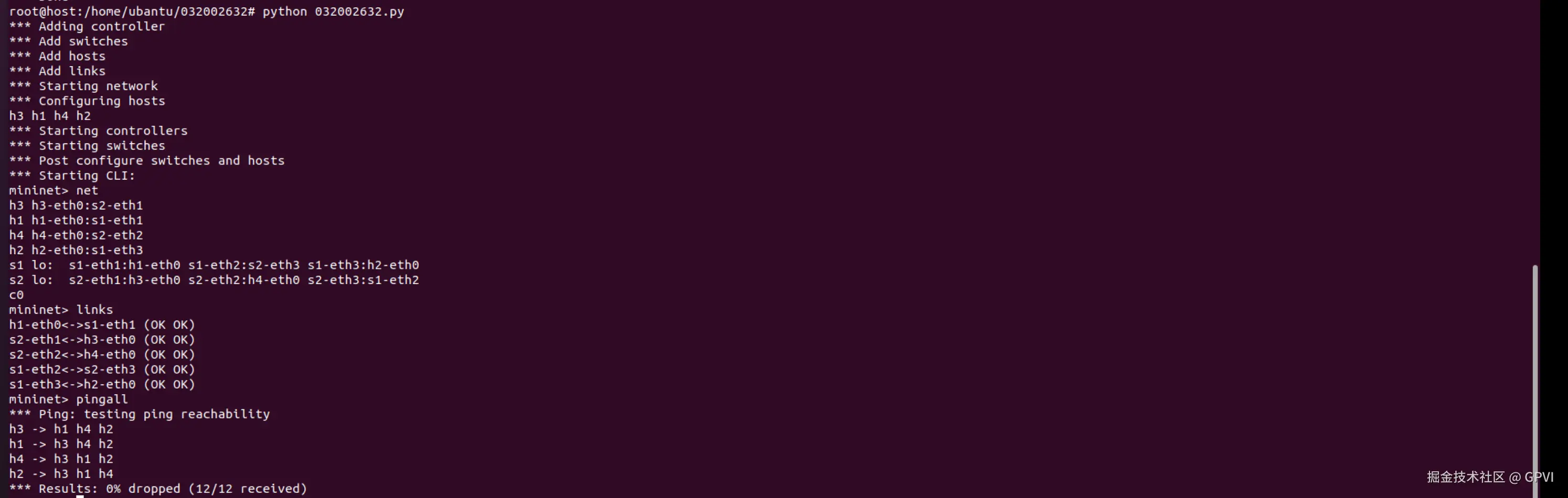 1. 使用Mininet可视化工具,生成下图所示的拓扑,并保存拓扑文件名为学号.py,运行结果